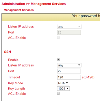Under Administration > Management Services the access to the web interface with HTTP and HTTPS as well as to the Command Line Interface (CLI) via Telnet and SSH can be configured.