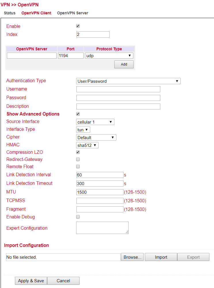 To import an existing configuration, an existing configuration file must be selected via Browse…. After the correct file has been selected, the configuration can be imported to the router via Import. After successfully importing the configuration, the router displays a button for restarting. After the restart the router will have the new configuration.