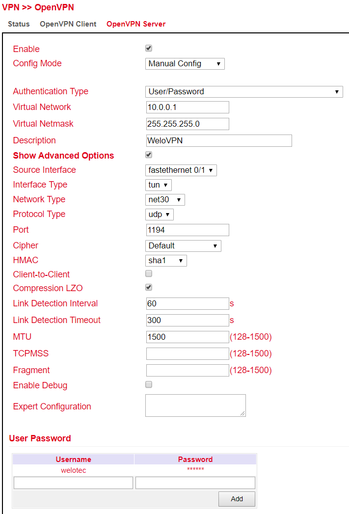 If there is no activity during the timeout period, the connection is terminated. Under Key Mode and Key Length the encryption standard and the key length can be selected.