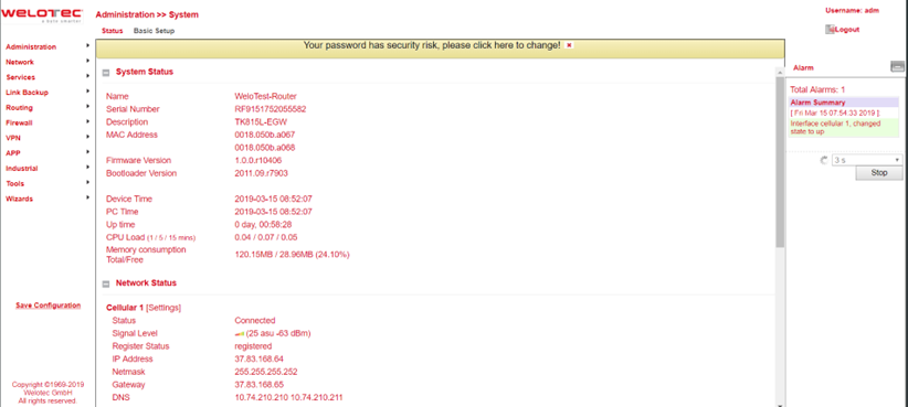 Under Administration > System > Status you will find the most important Status information of the router at a glance. Via the button Sync Time the time of the router can be synchronized with the time of the connected PC. If you use the default password for login (123456), a yellow bar will indicate that this is a security risk and should be changed. You can do this by clicking on the hint. We strongly recommend that you do this for security reasons!